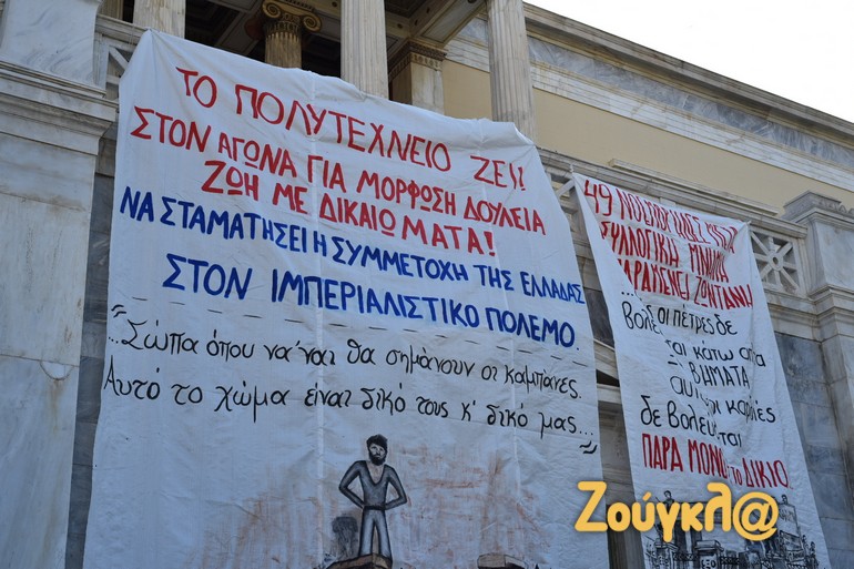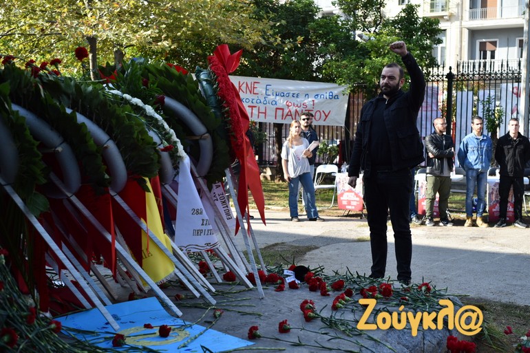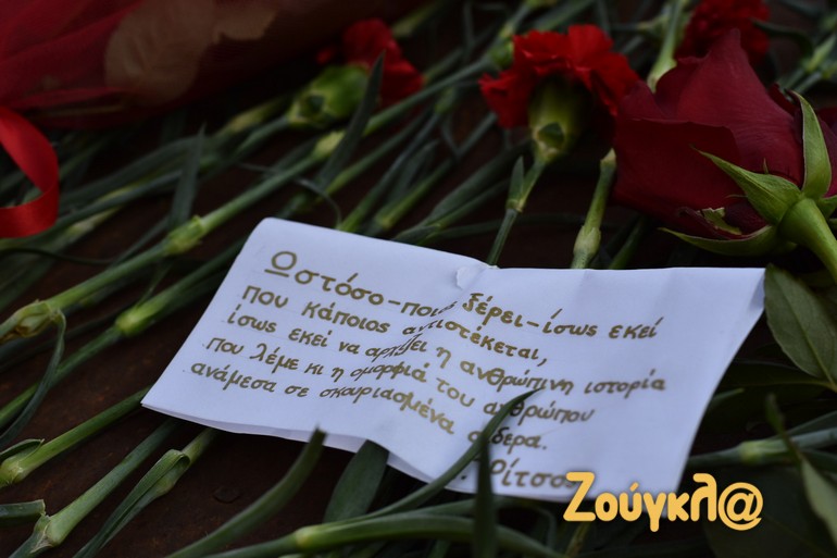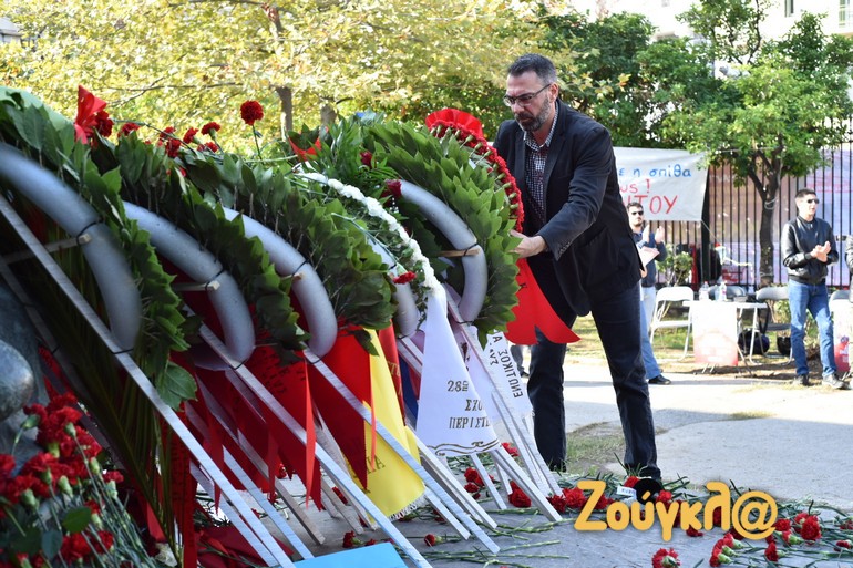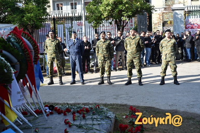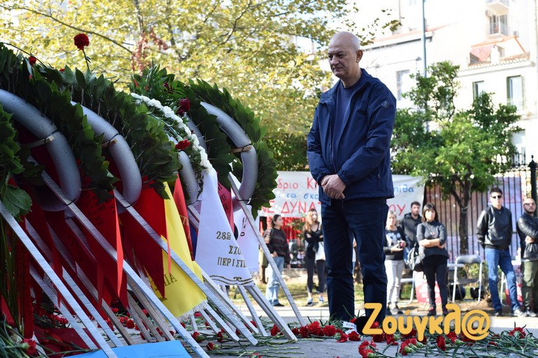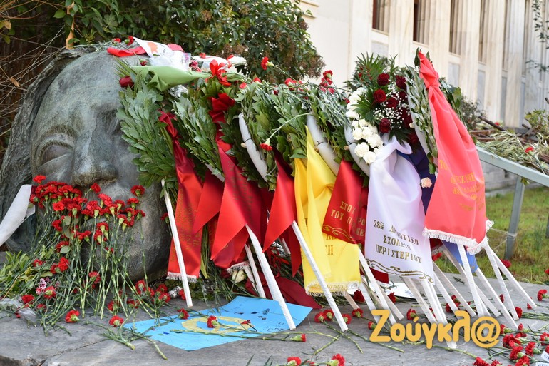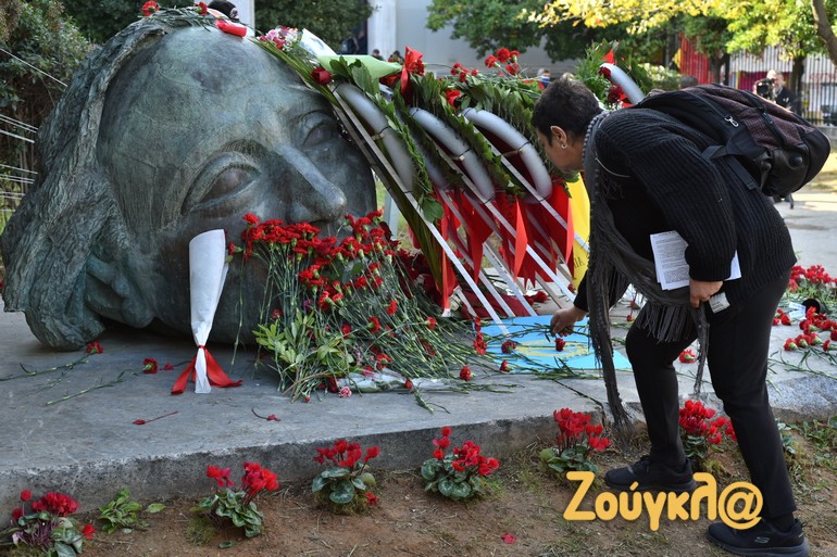 Παιδιά, φοιτητές και μεσήλικες που έχουν ζήσει από κοντά την ιστορική εξέγερση άφησαν ένα λουλούδι στο μνημείο που δημιούργησε ο Μέμος Μακρής και ύψωσαν τη γροθιά τους για να τιμήσουν τους φοιτητές που έδωσαν τον αγώνα εναντίον της δικτατορίας των Συνταγματαρχών.