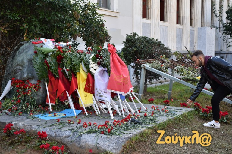Εκατοντάδες πολίτες καταθέτουν από το πρωί στεφάνια και λουλούδια στο Πολυτεχνείο, τιμώντας την επέτειο των 49 χρόνων από την εξέγερση.