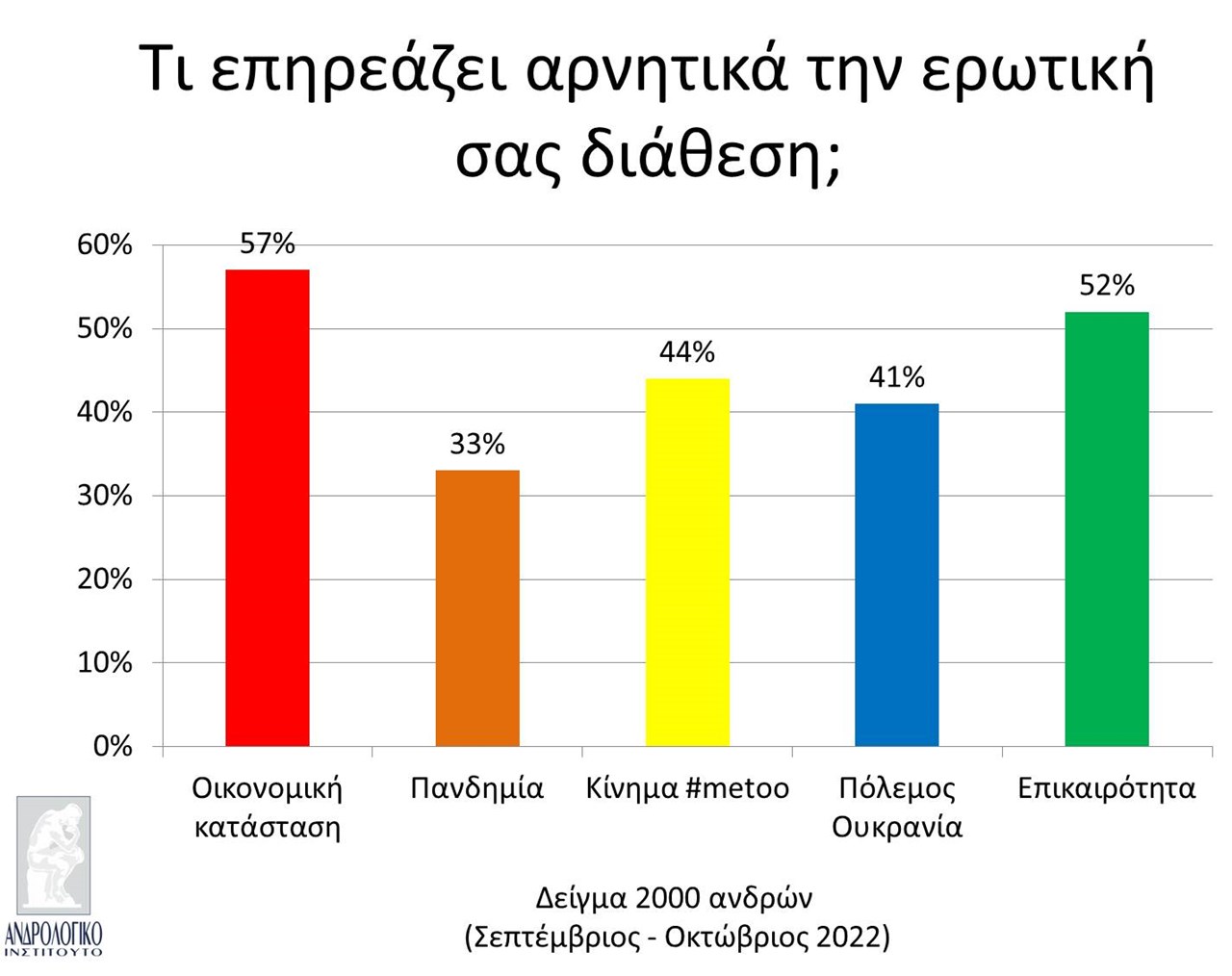 Οικονομική κρίση, πανδημία, κίνημα #metoo, εισβολή στην Ουκρανία αλλά και γενικότερα η επικαιρότητα φαίνεται ότι έχουν αρνητική επίδραση στην ερωτική επιθυμία με αποτέλεσμα ένα 37% των νέων ανδρώνστη χώρα μας, ηλικίας 18-25 ετών να δηλώνει ότι απέχει εβδομαδιαίως από τη σεξουαλική πράξη, ενώ στους μεγαλύτερους τα πράγματα δείχνουν σημαντικά καλύτερα με τους άνδρες 50 – 70 ετών να απέχουν σε ποσοστό μόλις 15%! Τα ποσοστά αυτά προέρχονται από πρόσφατη έρευνα του Ανδρολογικού Ινστιτούτου και αφορούν δείγμα 2.000 ανδρών και σε σύγκριση με περασμένες δεκαετίες δείχνουν την πτωτική πορεία της σεξουαλικής ζωής των νέων αντρών.